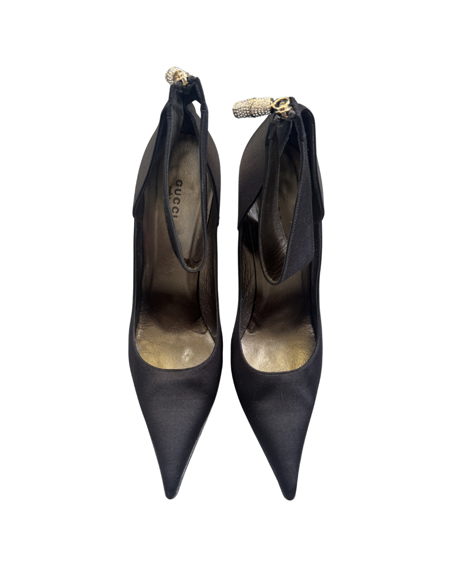 Gucci by Tom Ford Black Satin Pumps w/ Ankle Strap & Crystal Embellished Bamboo Zipper Pull